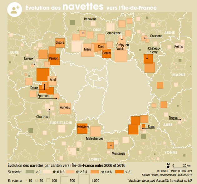La carte la plus récente diponibles des distances domicile-travail en fonction du lieu d’habitation est donnée dans l’Atlas des franciliens 2021 (Cf. LesFranciliens_2021.pdf (institutparisregion.fr) )