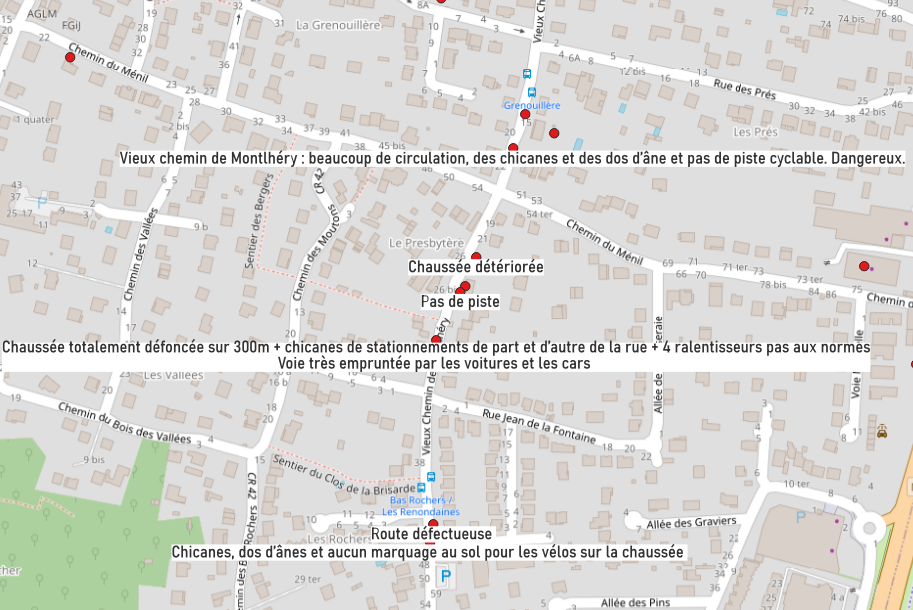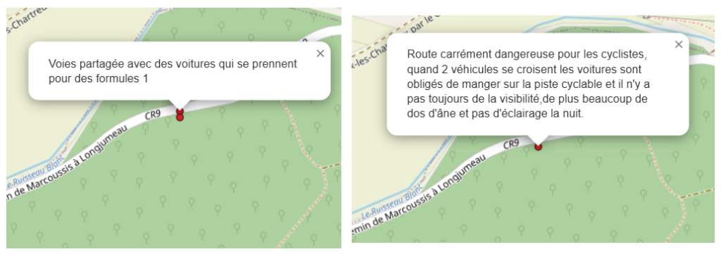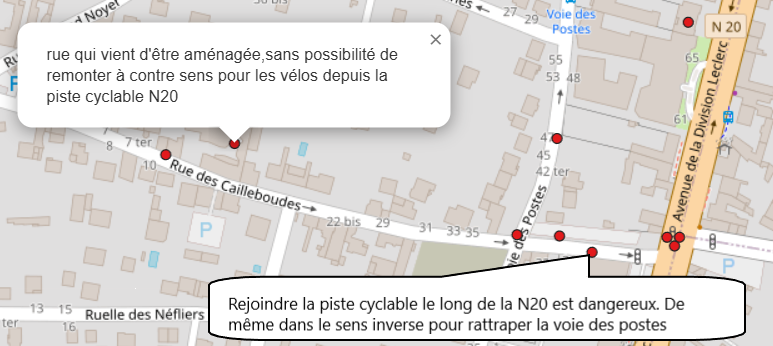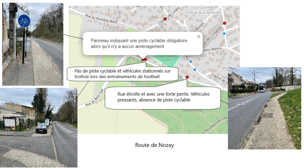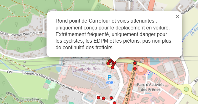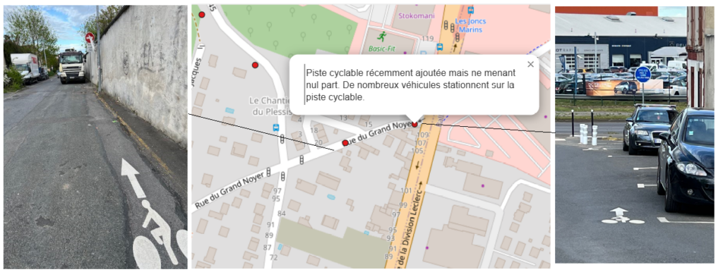 La carte ci-dessous, disponible en lien , permet de visualiser les aménagements satisfaisants (points verts), les points difficiles (points rouges) et les emplacements stationnement vélo souhaités (points bleus)
