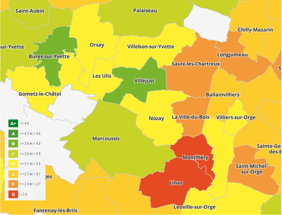 Si on regarde les résultats pour le département de l’Essonne, sur les 95 villes pour lesquelles le nombre de réponses a été suffisant pour qu’elles soient analysées, La Ville-du-Bois se situe à la 86e place, alors que Bures-sur-Yvette arrive en tête et Villejust en 3e position.