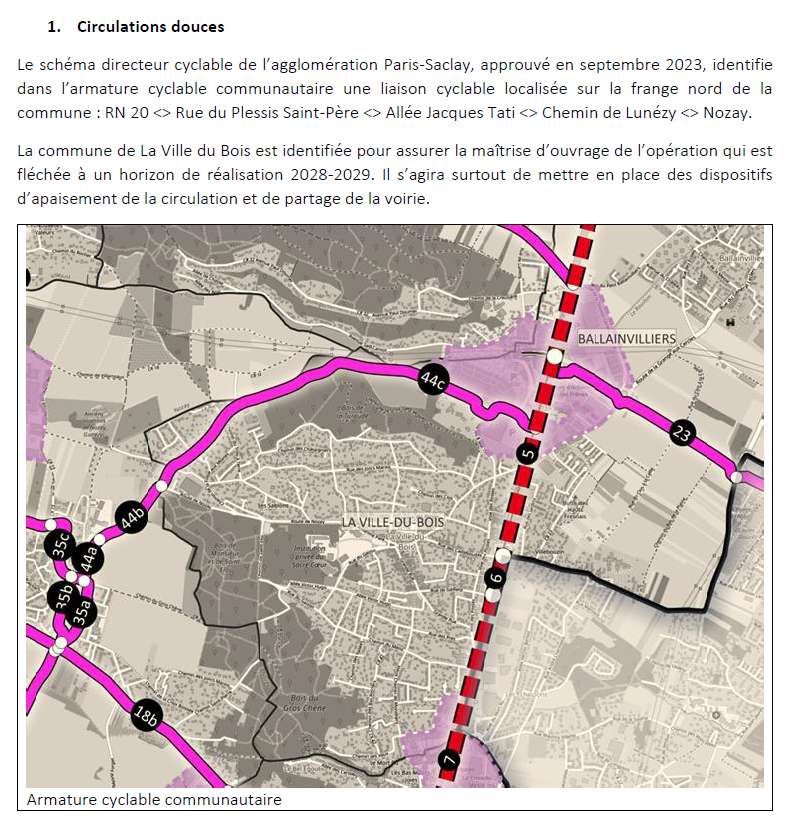 Le schéma directeur cyclable de l’agglomération Paris Saclay approuvé en septembre 2023, mentionne une jonction cyclable RN20-CR9-Nozay à réaliser par la commune de la Ville-du-Bois en 2028-2029.