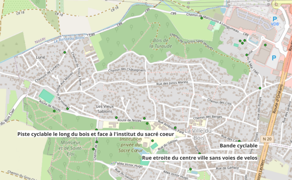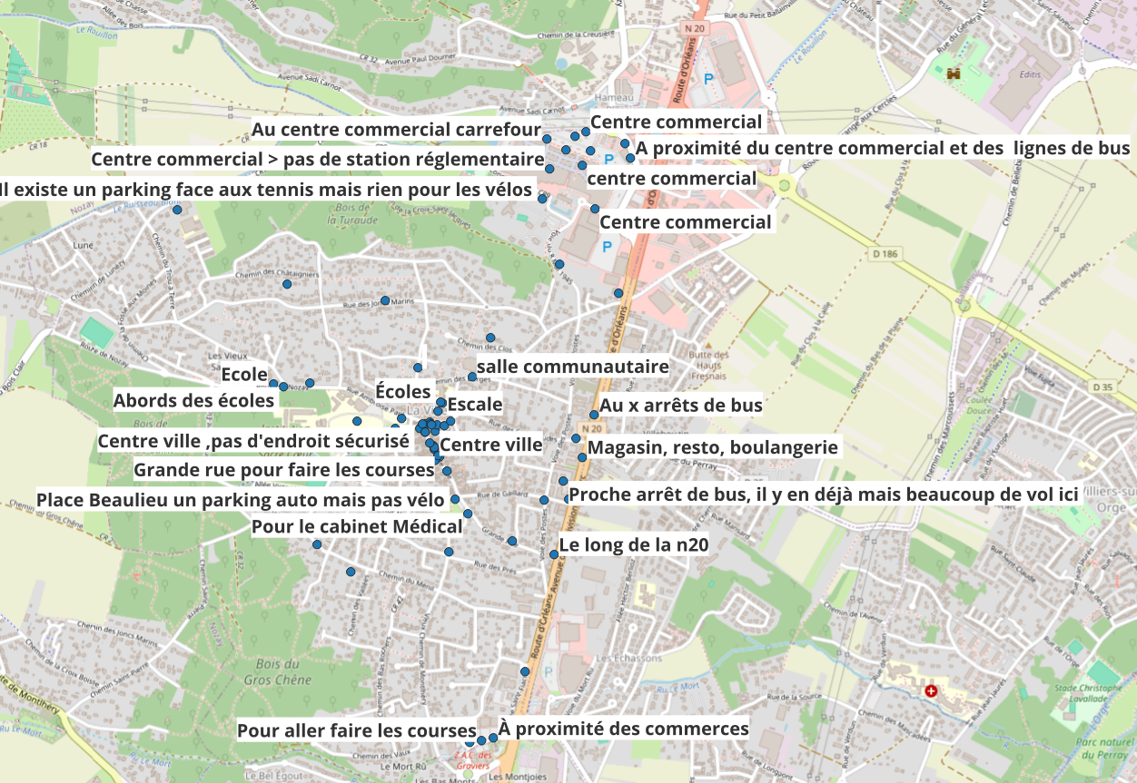 Les données sont disponibles en open data (voir Le Baromètre Vélo) et nous avons replacés les points situés à La Ville-du-Bois sur un fond de carte plus parlant.