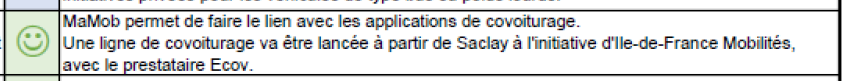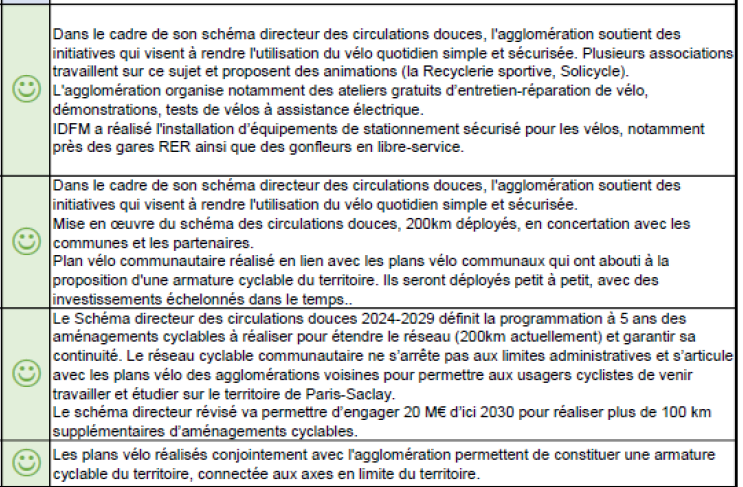 Ainsi, dans le bilan des actions 2019-2024 sur le thème de la mobilité, voici quelques actions jugées satisfaisantes du point de vue de la Communauté Paris-Saclay, mais qui ne s’appliquent pas sur notre commune :