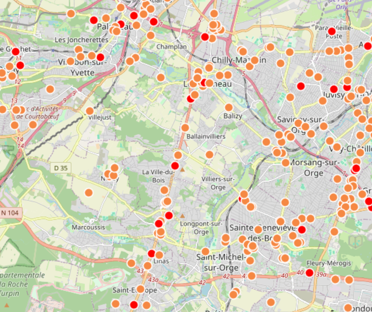 Nous avons sélectionné tous les accidents de piétons graves (points oranges) ou mortels (points rouges) pour la période 2015-2024 : la RN20 apparaît comme accidentogène.
