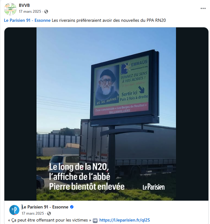 Alors que le journal Le Parisien titrait sur une affiche de l’Abbé Pierre sur la RN20 à hauteur de La Ville-du-Bois, nous commentions que les riverains préfèreraient avoir des nouvelles du PPA RN20.