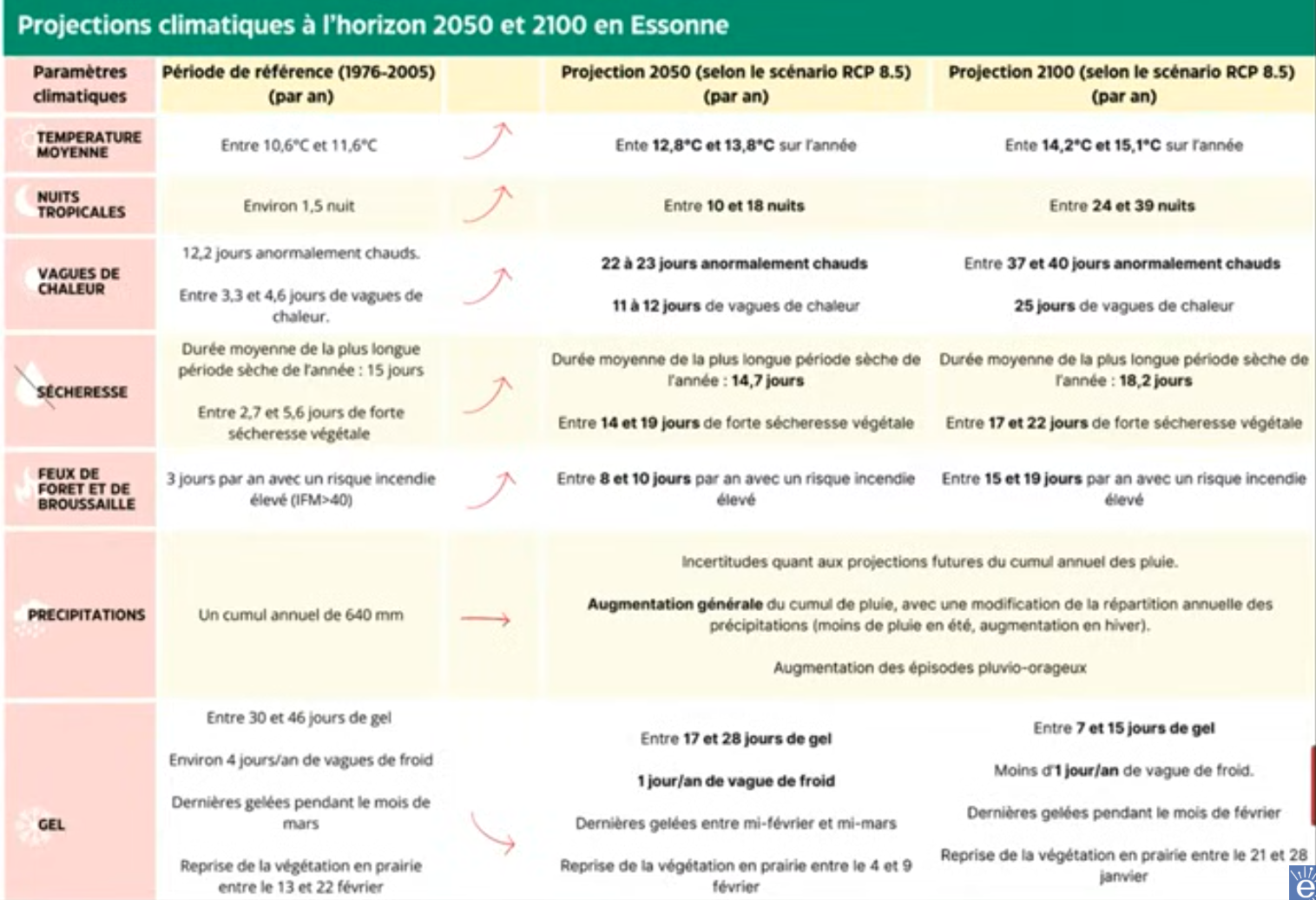 Ont aussi été présentés les impacts prévisibles du changement climatique en Essonne . L’image ci-dessous est une copie d’écran un peu floue de la présentation (cliquer pour agrandir) . Parmi les points à retenir, le nombre de jours de sécheresse augmentera rapidement, ce qui impactera fortement les activités agricoles du département.